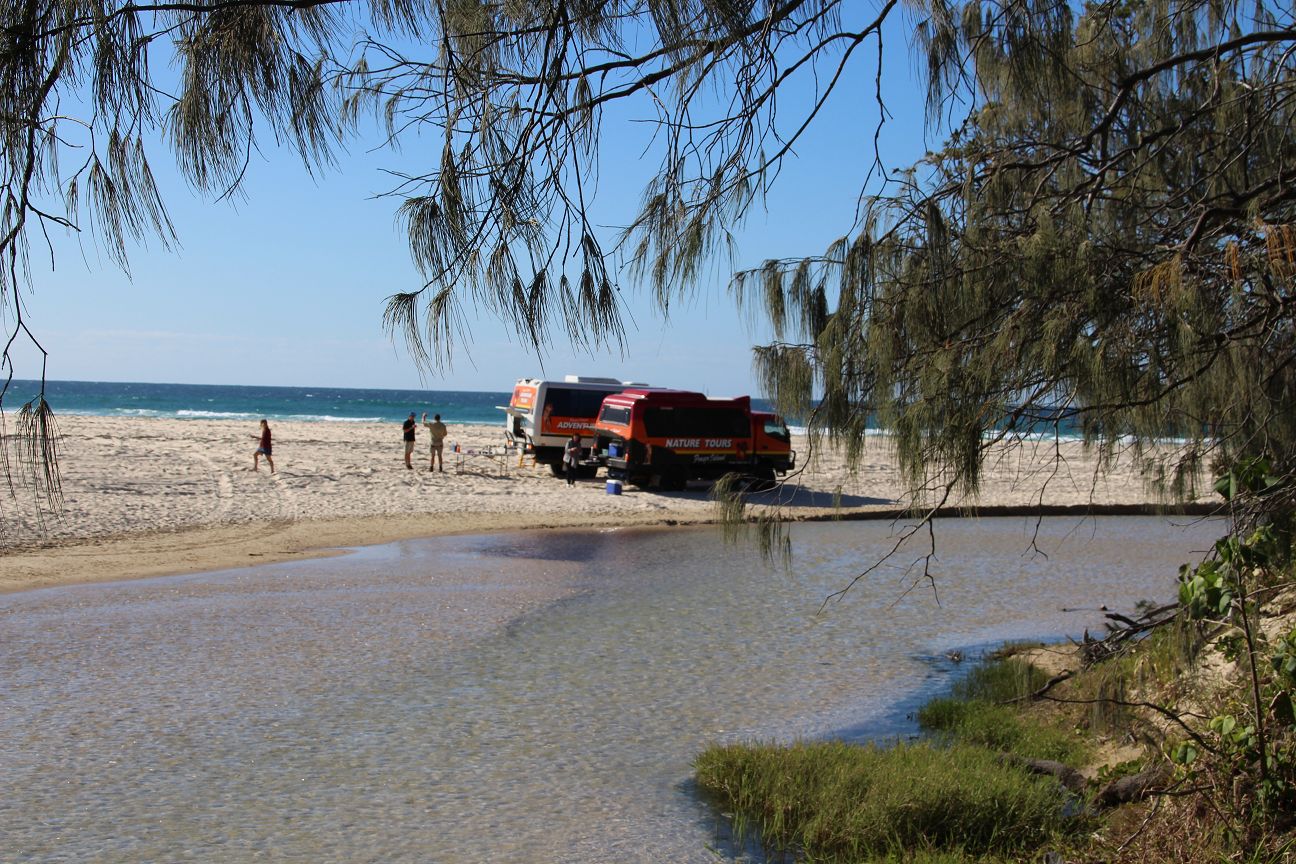 Von einem Arbeitskollegen habe ich den Tipp bekommen, Fraser Island zu besuchen.Der Tipp war Gold wert. Wir haben heute bei strahlendem Sonnenschein einen Tagesausflug auf die größte Sandinsel der Welt gemacht und unglaubliche Eindrücke mitgenommen. Auf die Insel dürfen nur Geländewagen oder Fahrzeuge mit einem Allradantrieb (4WD) . Daher mussten wir eine Tour buchen und unseren Camper auf dem Festland stehen lassen. Anja und ich sind morgens um 7:30 Uhr von einer Touristenkutsche (Allradbus) abgeholt worden. Da wir die letzten Touris waren, die eingesammelt wurden, haben wir zu Anfang getrennt gesessen. Anja war nicht wirklich begeistert, da unser Kutscher ein ziemlich verwaschenes, undeutliches Englisch sprach, dass selbst ich kaum verstanden habe. Nach dem zweiten Halt haben wir gemeinsam gesessen.